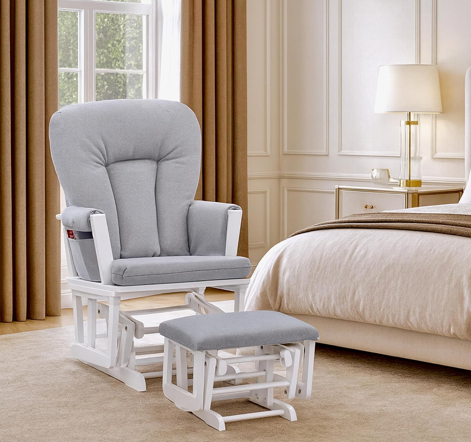 The Contempo wooden glider and matching ottoman by Suite Bebé emulates its namesake. Contemporary in design with straight lines, oversized back pillow with curved pattern stitching sets this apart from the other players. Smooth quiet glide motion will lull your baby to sleep in no time. The comfortable plush back cushion and padded arms add extra comfort where needed. The bonus is the matching gliding ottoman that when you rest your feet, you feel like you are swinging in the clouds. Constructed of solid durable wood and easy to clean fabric, the Contempo has a style to coordinate with any furniture in the nursery or home.